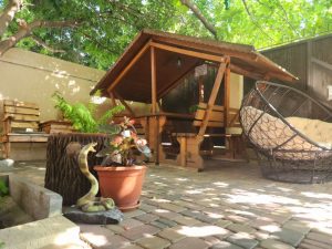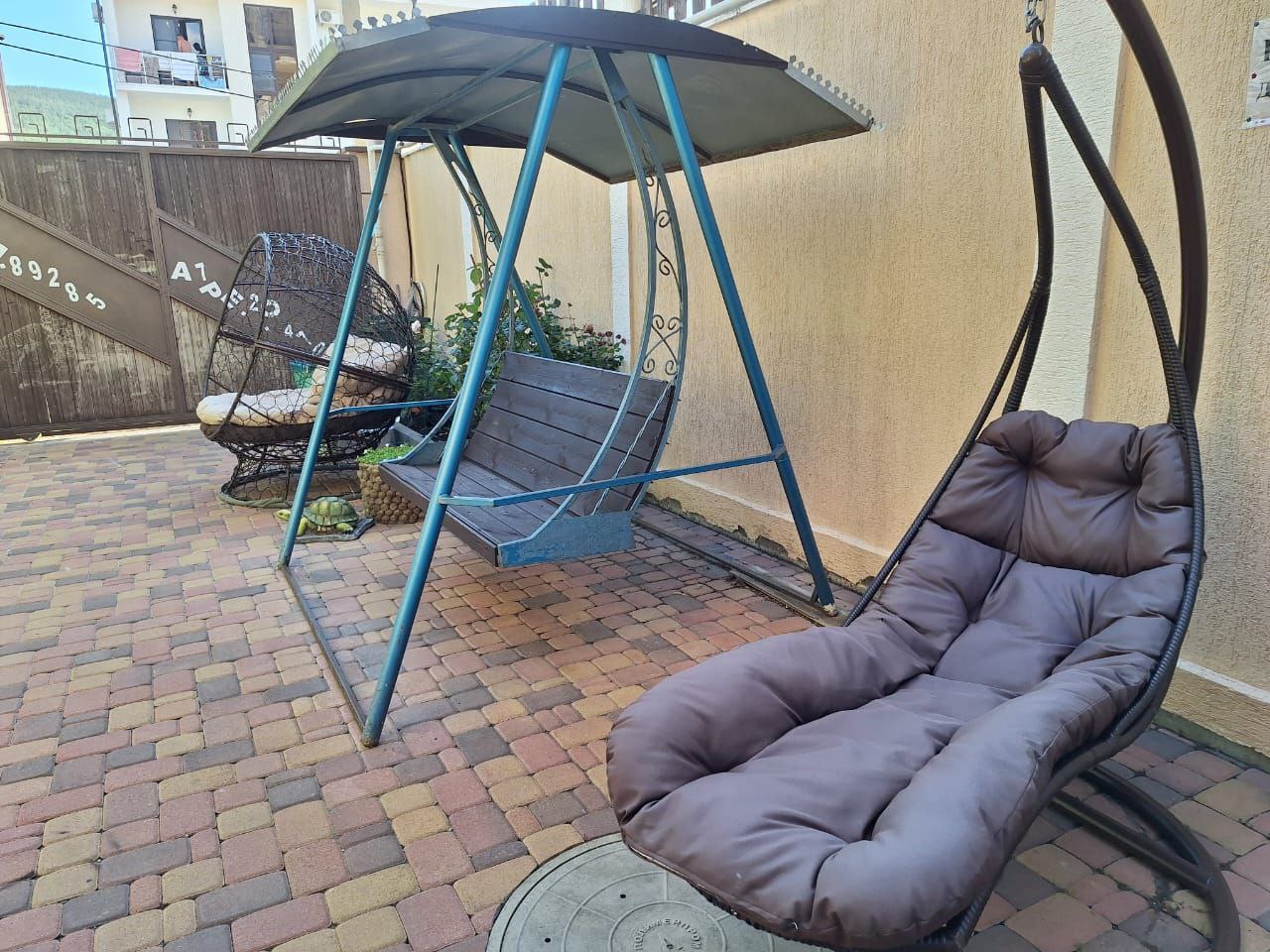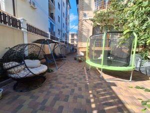 Территория украшена яркими цветами и зеленью, в уютном внутреннем дворике Вы найдёте столики с зонтиками, беседку, мангал и батут — идеальное место для отдыха и весёлого времяпрепровождения всей семьёй.