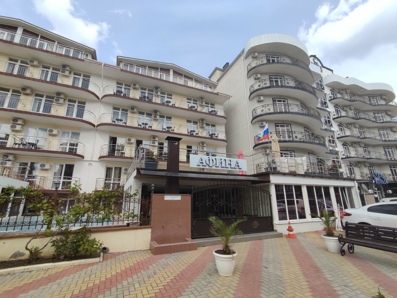 Отель представляет собой большое пятиэтажное здание с прилегающей территорией, оборудованной всем необходимым для приятного и безопасного отдыха. В «Афине» есть собственный просторный подогреваемый бассейн с пресной водой, открытая терраса, зона для загара с шезлонгами и зонтиками, игровая площадка для детей, столовая, кафе.